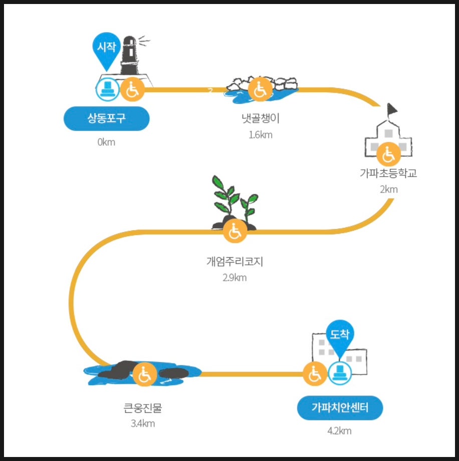 상동포구-냇골챙이-가파초등학교-개엄주리코지-큰 웅진물-가파치 안센터 모두 4.2km / 상동포구까지 되돌아와야 해서 약 2시간 소요됩니다.